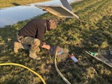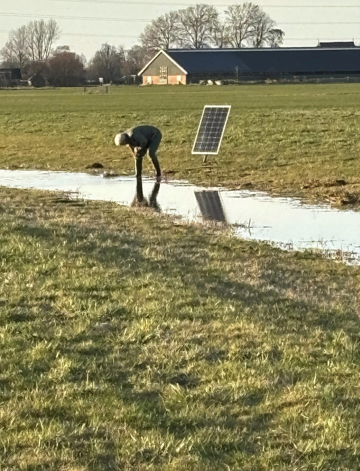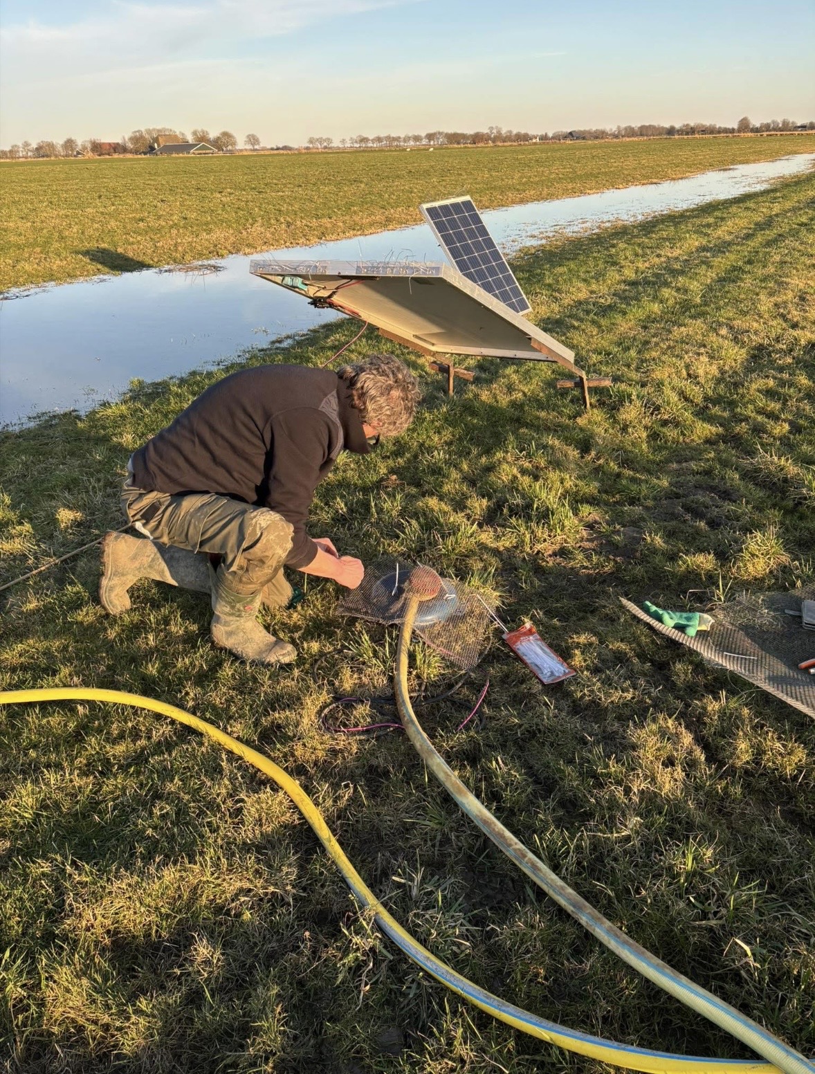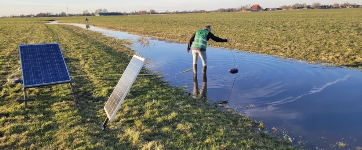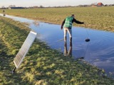 Anton Bakker, Herman Koops en Jan Bakker, nazorgers van Vogelbeschermingswacht Sneek e.o., hebben de plasdras pompen weer aangebracht op het land van Melkveebedrijf Sibe Wijbrandi.